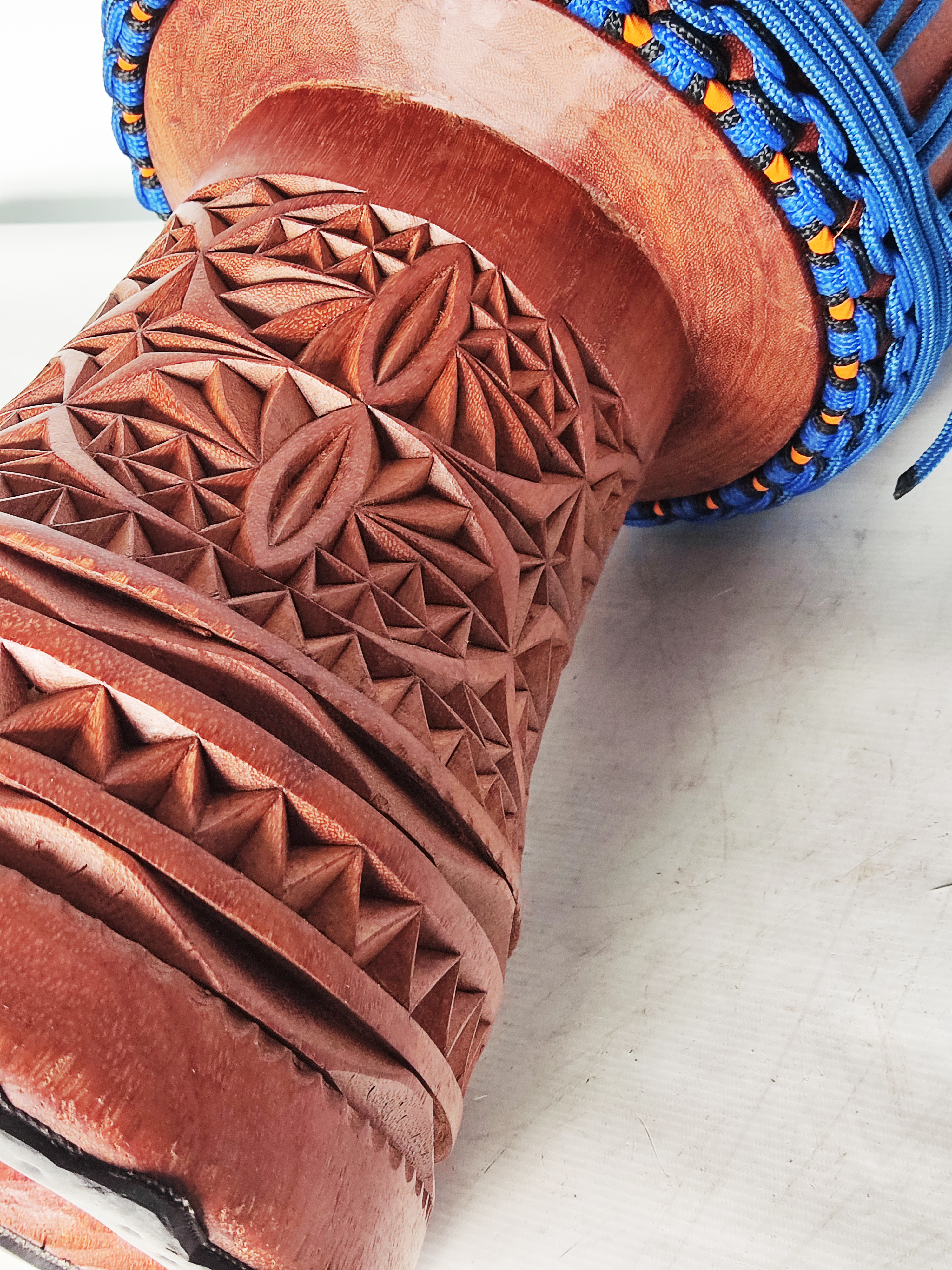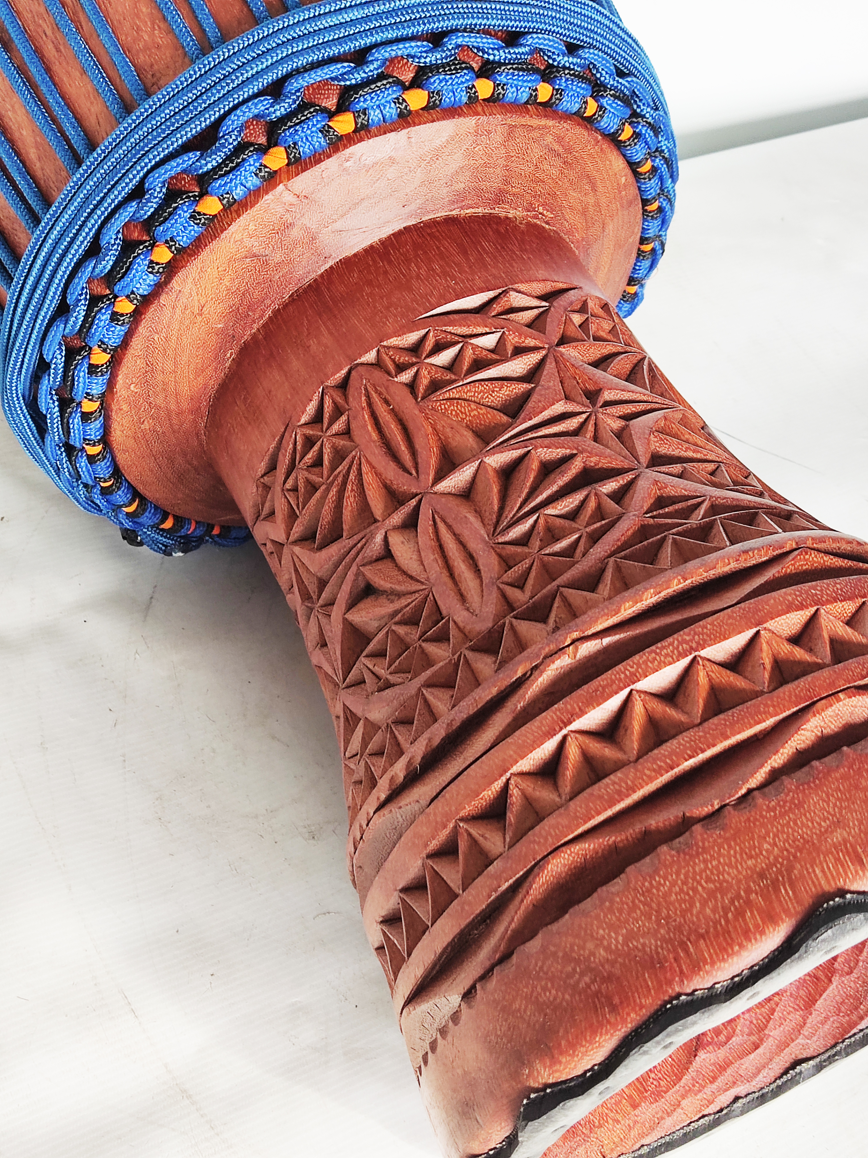 Djembe 6028. A work of art this djembe from Guinea and assembled by Mathieu Taylor; craftsmanship. Great bass, tone and slaps. The deerskin is really fantastic. Delivery to the Netherlands within 5 days. I am super satisfied with this Djembe and about african-percussion.net