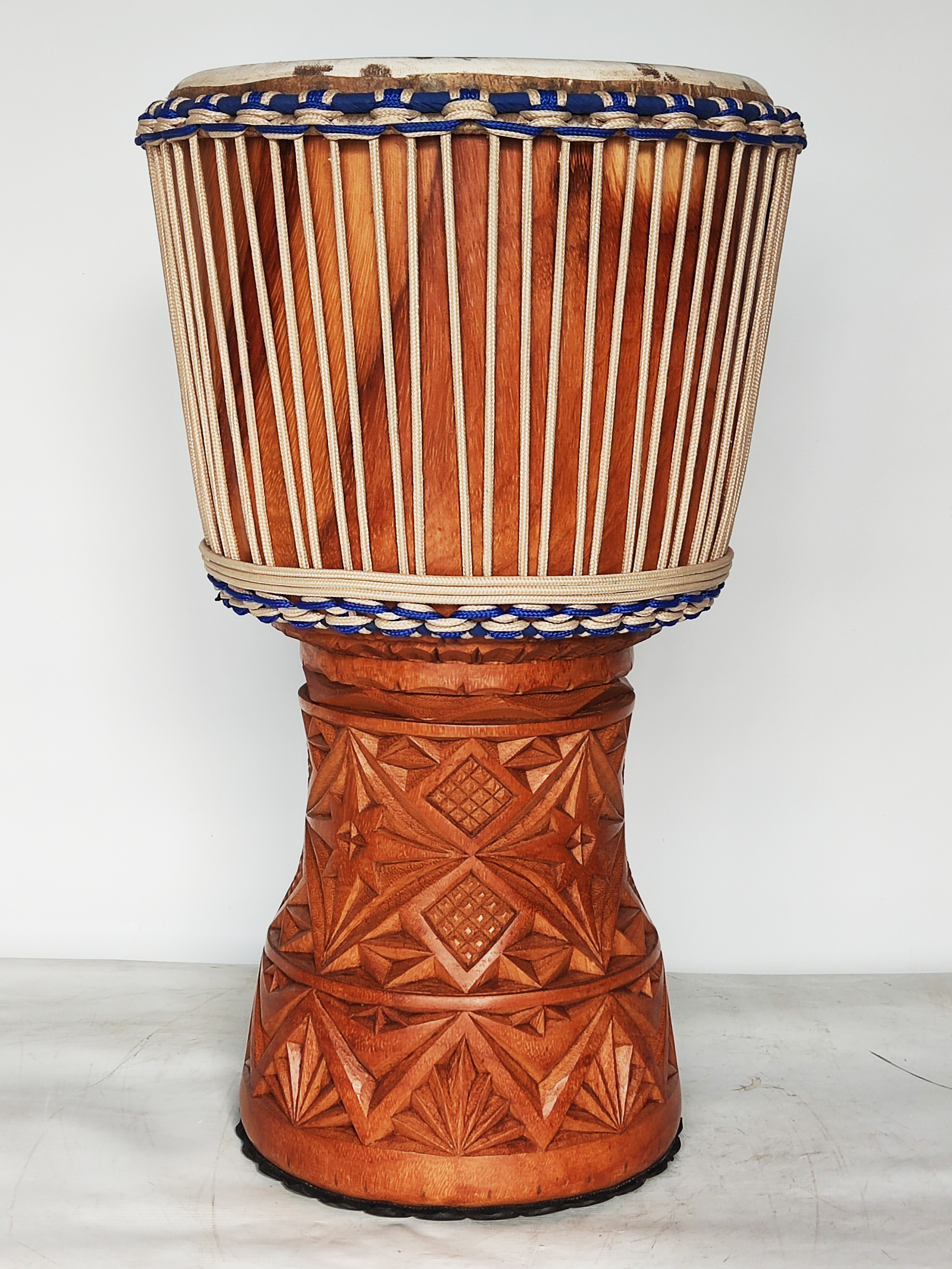 Djembe 6028. A work of art this djembe from Guinea and assembled by Mathieu Taylor; craftsmanship. Great bass, tone and slaps. The deerskin is really fantastic. Delivery to the Netherlands within 5 days. I am super satisfied with this Djembe and about african-percussion.net