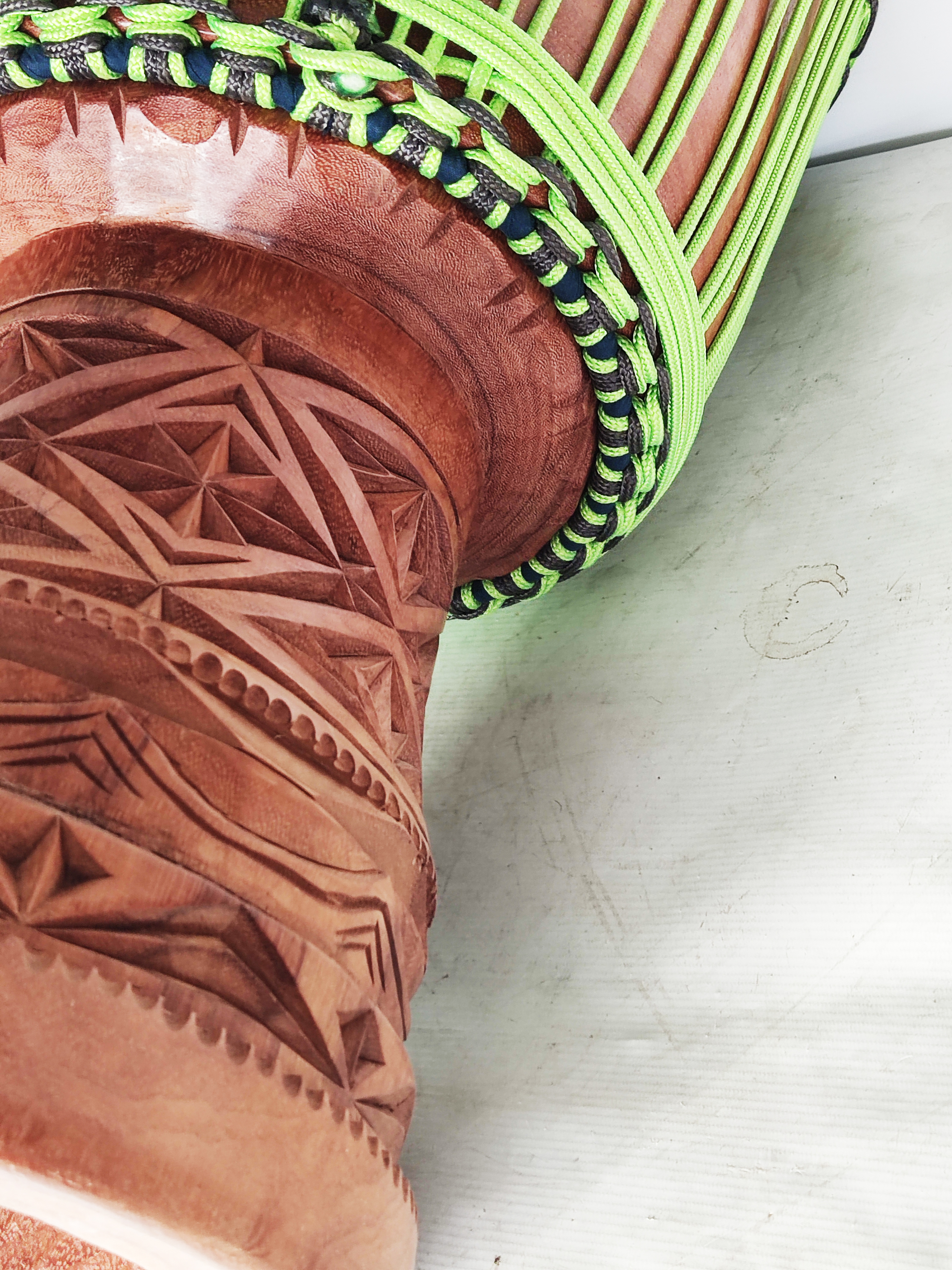 Djembe 6028. A work of art this djembe from Guinea and assembled by Mathieu Taylor; craftsmanship. Great bass, tone and slaps. The deerskin is really fantastic. Delivery to the Netherlands within 5 days. I am super satisfied with this Djembe and about african-percussion.net