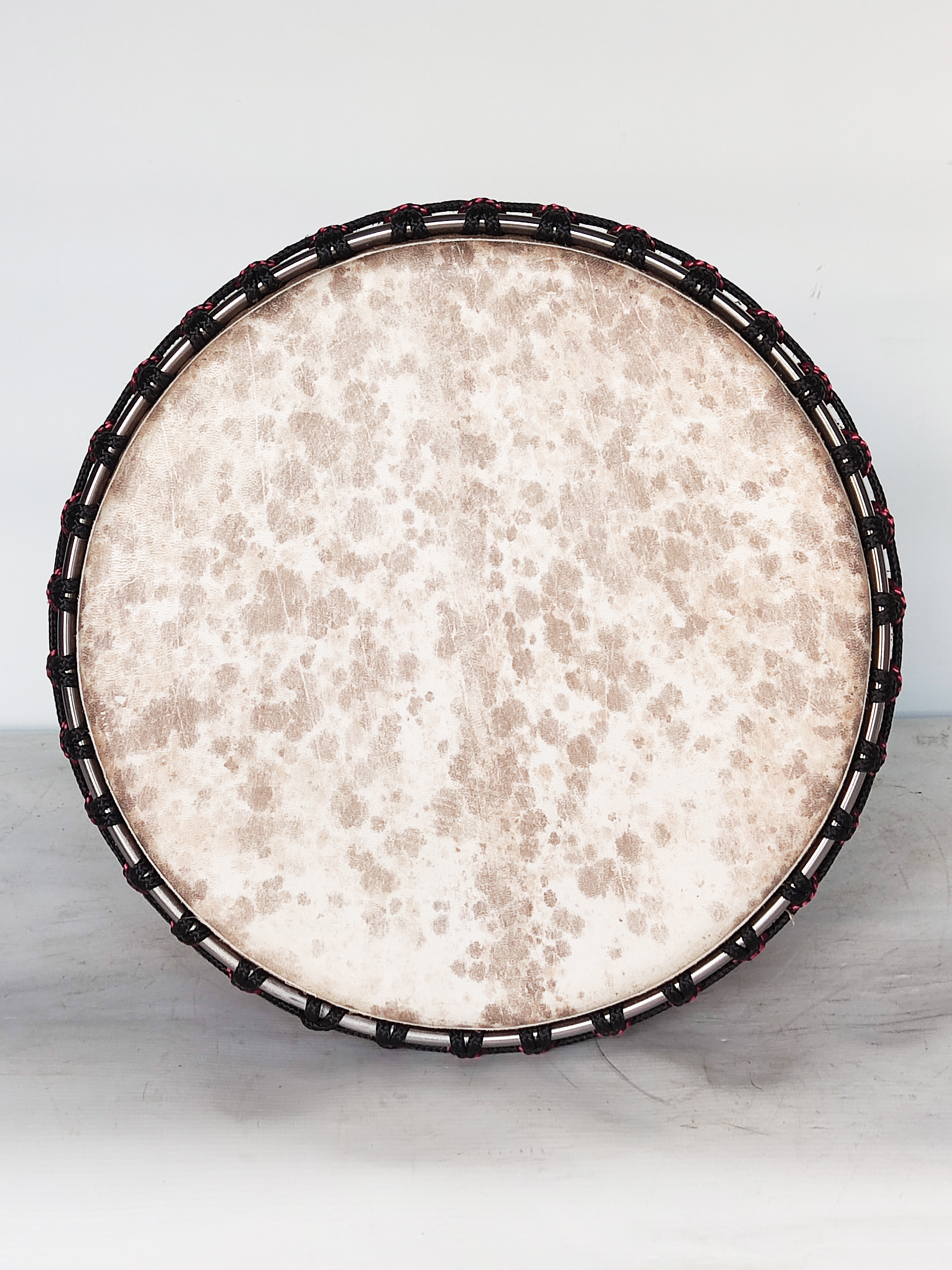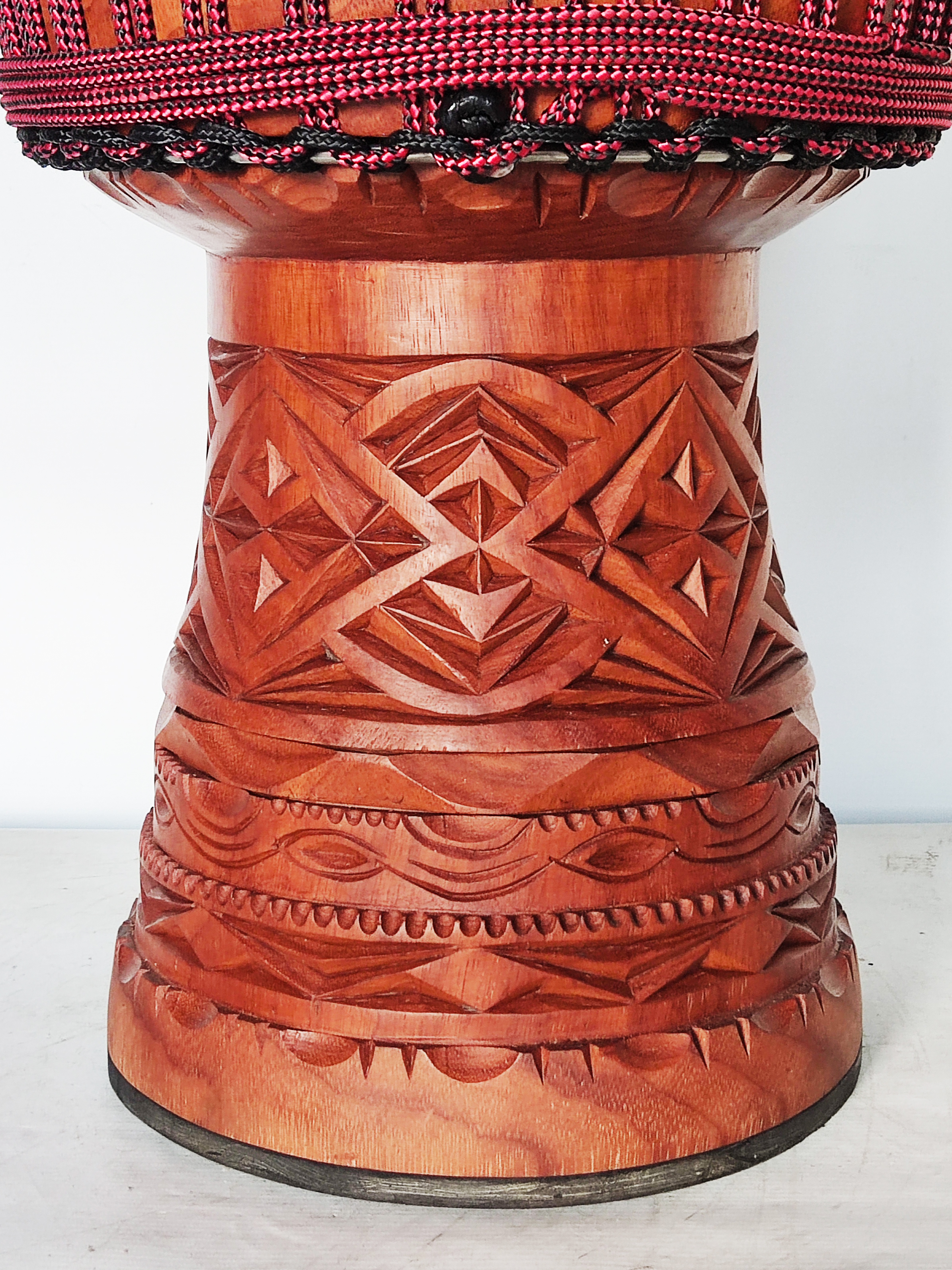 Djembe 6028. A work of art this djembe from Guinea and assembled by Mathieu Taylor; craftsmanship. Great bass, tone and slaps. The deerskin is really fantastic. Delivery to the Netherlands within 5 days. I am super satisfied with this Djembe and about african-percussion.net