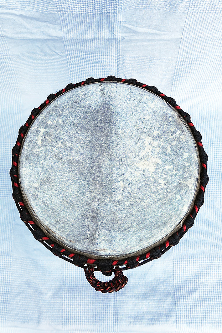 Preemptively re-balanced using a specially adapted wood lathe, the shell of this djembe is polished through a series of sandings using progressively finer sandpapers. Any tiny micro-fractures are chamfered and glued with extraordinary precision.
