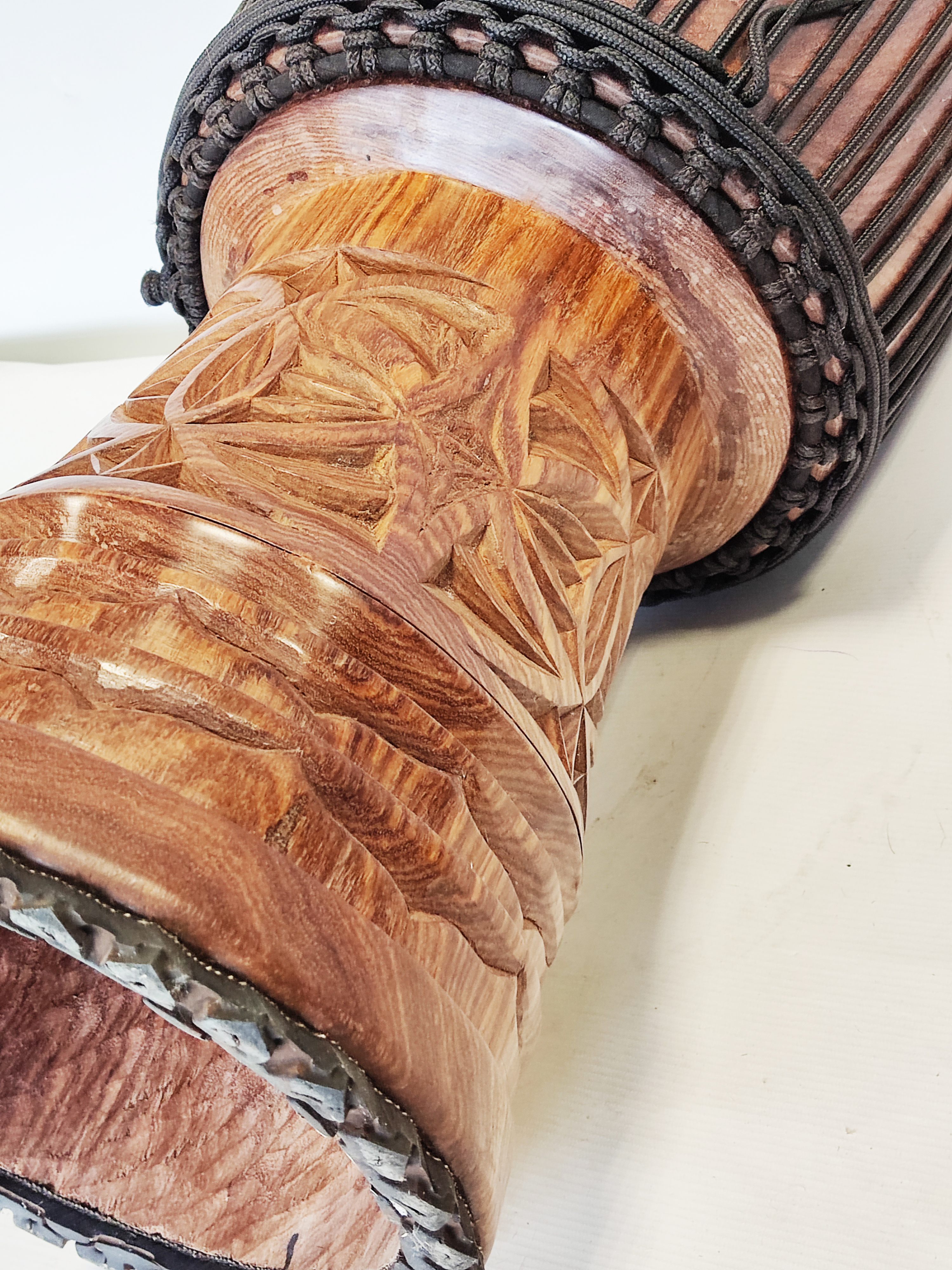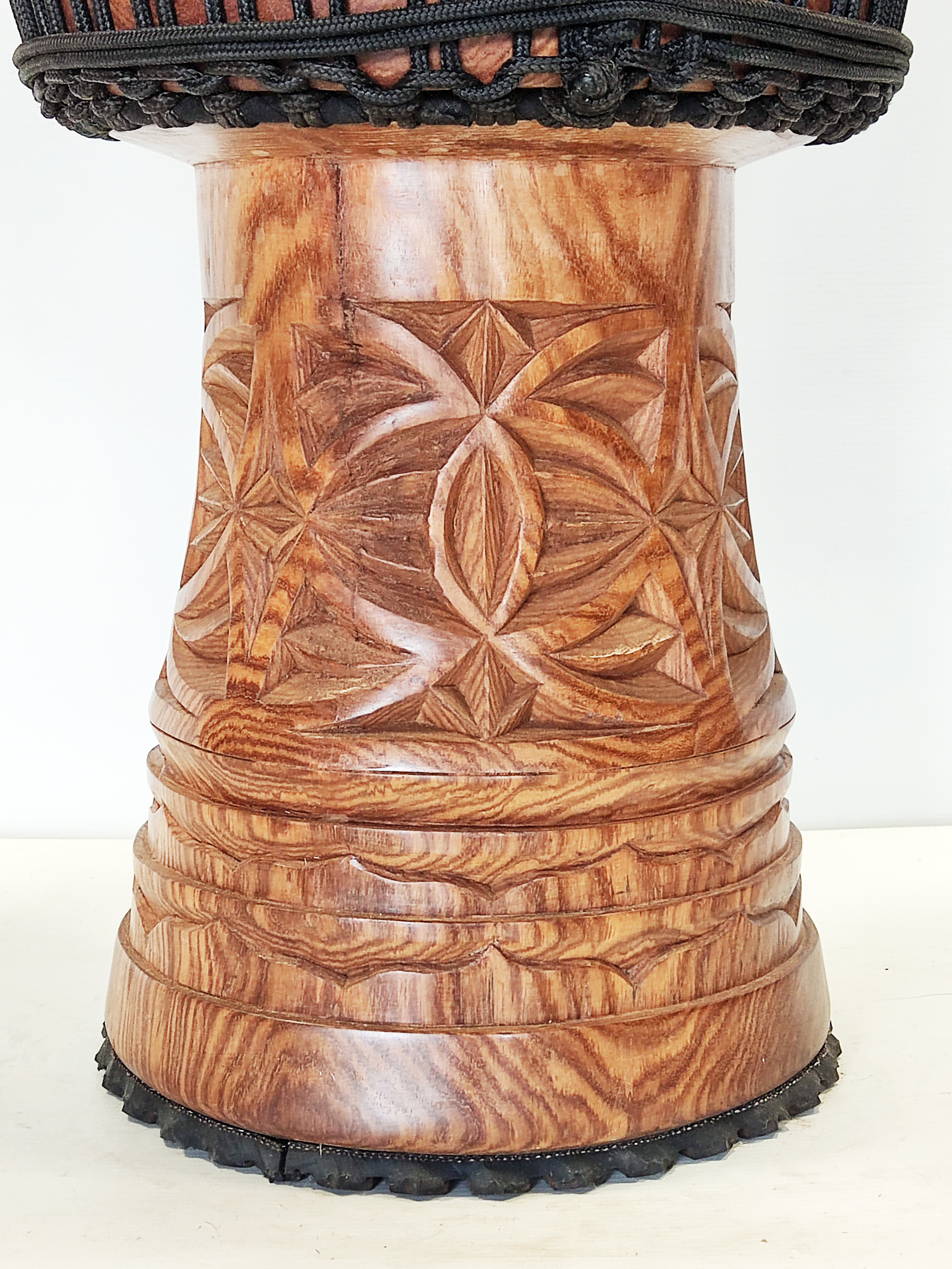 Couldn’t ask for more! The sound of this special Lenke wood ! goatskin, Guinean. Djembe is all that I hoped it would be and more. Perfectly tuned. The most authentic sound, resonance and vibe. Beautiful carving. Goat hair folded over the rings. Rubber tyre on the foot.