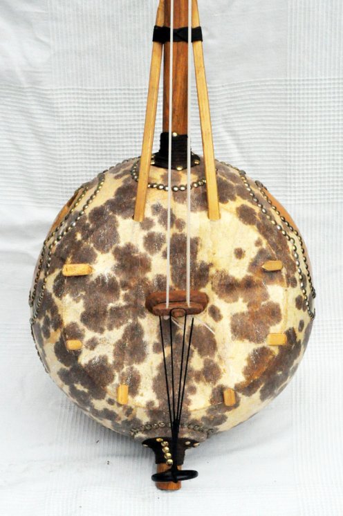 The ngoni is a typically African stringed instrument from Mali formed of a resonant shell covered with a goatskin (or a wooden cover), with a wooden handle. The strings, made of nylon, are attached with rings, parallel to the handle which follows the same line as the shell.